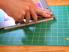 Utilice un cuchillo y una regla pesada (una escuadra de carpintero es ideal) para cortar aproximadamente 1/8" de la columna vertebral (o en la medida en que sea necesario para eliminar el grueso del pegamento).