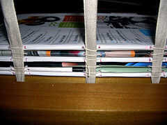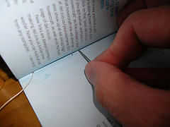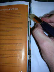 Quite el trabajo desde el puesto de costura. En este punto, es una buena idea aplicar un poco de pegamento (acerca de 1/4 ") en el interior de las firmas de la primeras y la últimas (utilice un pedazo de papel de desecho para proteger la parte de la página no va a pegar) y el trabajo con pesas (encontrar La edición compacta del Diccionario del Inglés de Oxford funciona bastante bien) durante la noche. Incluso después de su trabajo tienen costura, probablemente encontrarás las firmas están un poco flojas en los bordes exteriores, y esto hace un buen trabajo de poner firme encima de bloque del libro como una unidad sólida.