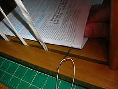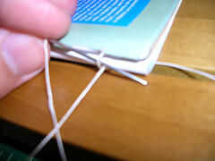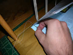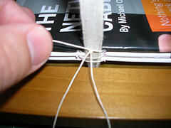 Cuando te quedas sin hilo, anudar una nueva 30" longitud al hilo existente. El mejor lugar para añadir nuevo hilo es justo antes de volver a entrar a la columna vertebral alrededor de una cinta.