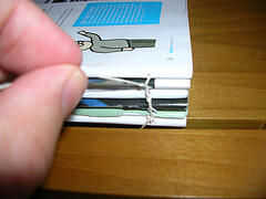 Mantener la costura de esta manera hasta que salga la espina dorsal en la cabeza kettlestitch. Coloque la firma siguiente sobre el que apenas he cosido y entra la columna vertebral en su cabeza kettlestich. Coser esta firma alrededor de las cintas al igual que la firma anterior. Al salir de la kettlestitch de pie, antes de entrar en la kettlestitch de pie de otra firma, enrolle el hilo alrededor de la kettlestitch pie de la primera firma, hacer un nudo.