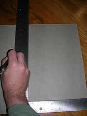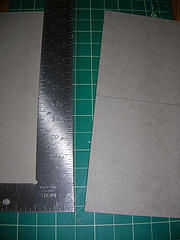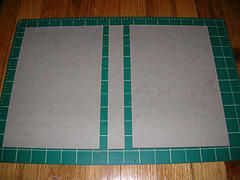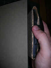 El borde del lado de la espina dorsal de la cubierta frontal debe reducirse por el grosor de dos tableros (en mi caso, 1/4"), para dar cabida a la bisagra. En conjunto, entonces, la portada se debe cortar a 1/4" más alto que la altura del libro (1/8" a la cabeza y el pie) y 1/8" más estrecha que el ancho del libro (después de sumar 1/8" y restar 1/4").
