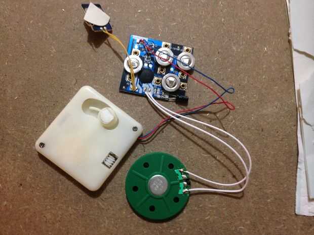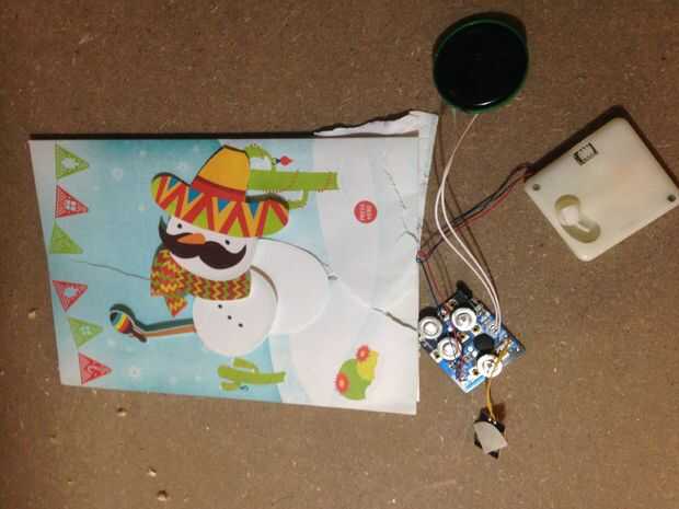 Encontré una tarjeta animada de Navidad en una tienda local para un par de dólares. Vino con un interruptor, altavoces, motor y placa de circuito. Retire con cuidado los componentes de la tarjeta y colóquela al lado. Comprobar todavía funciona o si es necesario, soldar las conexiones rotas.