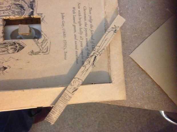 Luego tomé otro pedazo de cartulina y cortarlo a la medida para adaptarse a la elfa 3 de. Cubrí con una de las páginas guardadas. Luego pegué en el elf asegurarse les espacio correctamente y asegúrese de que no obstruyó el movimiento de los brazos y las piernas. Para lograr esto, he añadido a un separador detrás de cada elf (pequeños pedazos de cartulina cortadas y pegadas.