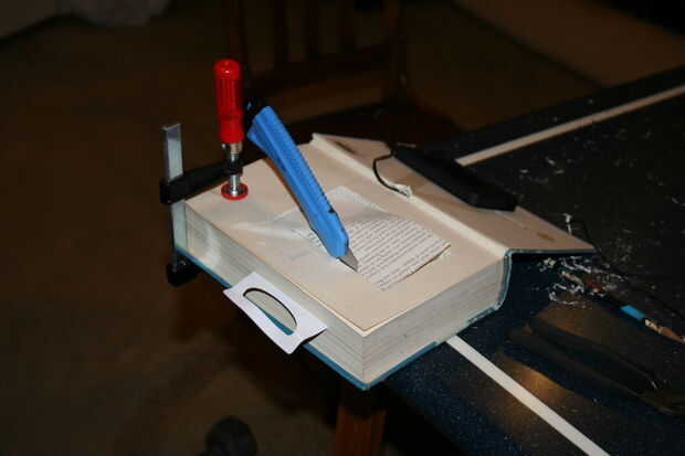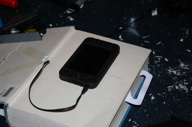 Ya que este es el frente del libro, se trata del más buscado en parte de su "libro audio". Esto significa que usted necesita tomar su tiempo y utilizar sus habilidades de corte nuevo libro para hacer esta zona se vea impecable. Esto sólo significa corta con cuidado y asegúrese que usted está cortando perpendicularmente a las páginas de libros. Antes de comenzar, quiere fijar las páginas como antes y Compruebe la profundidad tiene disponibles para usted (Recuerde que hay por ahora!). Desea dar una buena 40-50 páginas de papel sin cortar entre el iPod y cámaras de altavoces para asegurarse de que la calidad del sonido no cambia por el espesor de la pared.