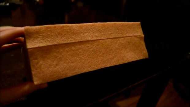 Luego con un fieltro beige había medida a lo largo de la frente y los lados y recorto. No te olvides de cortar los rectángulos donde se abre la caja.