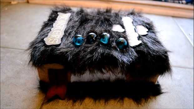 Recogí algunas canicas pequeñas de la tienda de dólar y une 4 de ellos por encima de los dientes que se asemejan a la araña como ojos, y luego usando a un viejo cinturón había recortar el exceso caliente pegado el borde para evitar que se deshilache y luego la hebilla en el centro del libro!