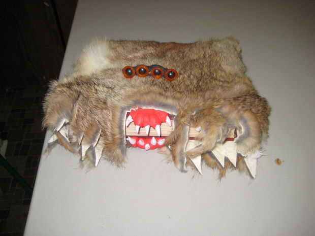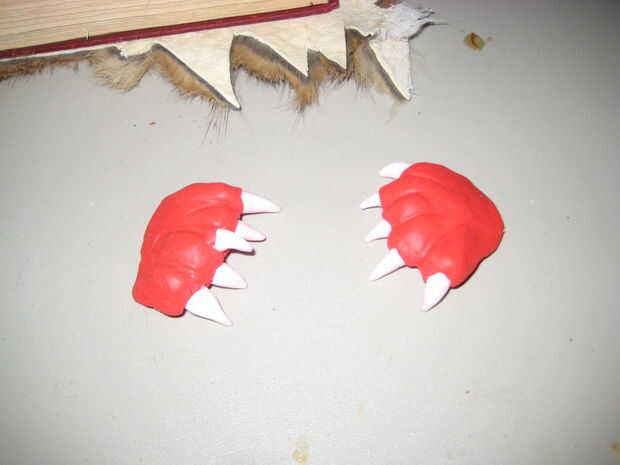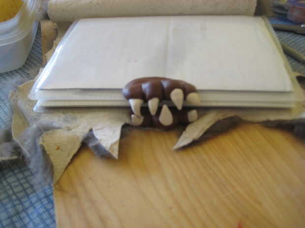 tomé clase de maquillaje de teatro en la Universidad ya tenía cierta experiencia en esculpir dientes. El mejor Consejo que puedo dar es hacer una forma ovalada con arcilla roja o marrón y a lo largo de un lado un golpe para cada diente, presionar una línea entre cada golpe. Luego tome el extremo de un lápiz o pincel y empuje un agujero en la protuberancia. Tomar un poco de arcilla blanca, rodar una bola pequeña luego pellizcar uno de los extremos y rollo para hacer un punto. Empuje el blanco "diente" en un agujero en la arcilla roja. Colocar los dientes en el borde del libro para ver cómo se miran y asegúrese de que hay una sección que se superpone al borde y es plano así que usted puede pegar en el libro. Para la base del ojo hacer que una pelota ovalada y aplanar la parte inferior. Situar la ojos plásticos en forma la parte superior hay un poco de arcilla que rodea los ojos-desea algo que los ojos pueden permanecer en el. No deje los ojos de plástico en la arcilla cuando se cuece al horno! Cocer todas las piezas según las instrucciones. Cuando las piezas estén frías, pegue los ojos de plástico en la base del ojo.