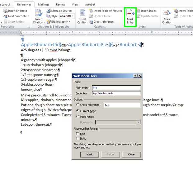 Resalte el título de la receta que está marcado para el índice. En la pestaña de referencias en Word, haga clic en marca de entrada.