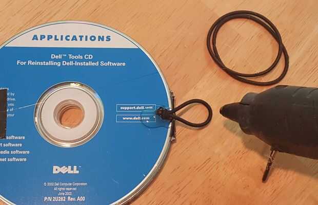 Doble CD como un acordeón y asegúrese de que se abre en el lado izquierdo (esta es la parte de atrás). Corte una pulgada cuatro pedazo de elástico o cortar una twanger de pelo, doble cinta de pegamento o pato 1/2 y luego caliente en lado derecho del CD superior con 1/2 del bucle que sobresale más allá de los CDs.