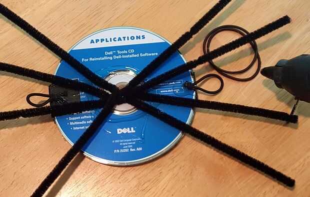 Doble CD como un acordeón y asegúrese de que se abre en el lado izquierdo (esta es la parte de atrás). Corte una pulgada cuatro pedazo de elástico o cortar una twanger de pelo, doble cinta de pegamento o pato 1/2 y luego caliente en lado derecho del CD superior con 1/2 del bucle que sobresale más allá de los CDs.