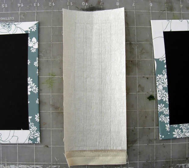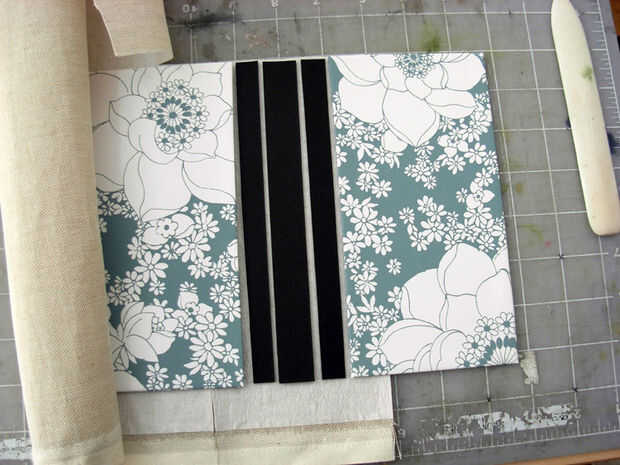 Coloque la cara de tela de libro sobre la almohadilla de corte. Coloque las piezas de cubierta de libro encima de la tela del libro tal como se muestra en el cuadro 1. Tenga en cuenta que al colocar las piezas, asegúrese de dejar 1/16" -1/8" espacio entre ellos. Si no dejas este espacio, su libro acabado no se abre correctamente. Desea que la tela del libro se superponen las cubiertas por unas 3/4" y de 1 el 1/2" más de la columna vertebral. Cortar esta pieza de la tela del libro. Trace una línea alrededor del exterior de las piezas de la columna vertebral con el lápiz (Foto 2).