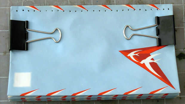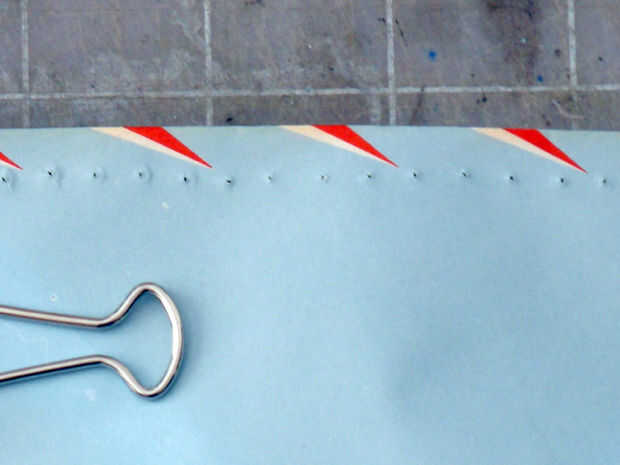 Desea perforar estos agujeros porque hará obligatorio su libro mucho más fácil, mejor y más rápido. Hay muchos métodos para pretaladrar los agujeros. Utilicé un alfiler y lo empujó a través, pero esto puede ser difícil en los dedos. Alternativas incluyen el uso de un punzón de encuadernadores, un clavo y martillo o una herramienta mini taladro. Asegúrese de que su perforación atraviesa todo el camino hasta el último envolvente.