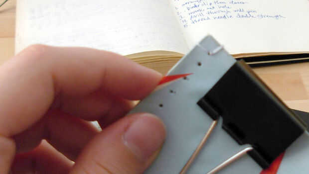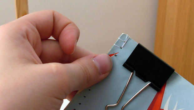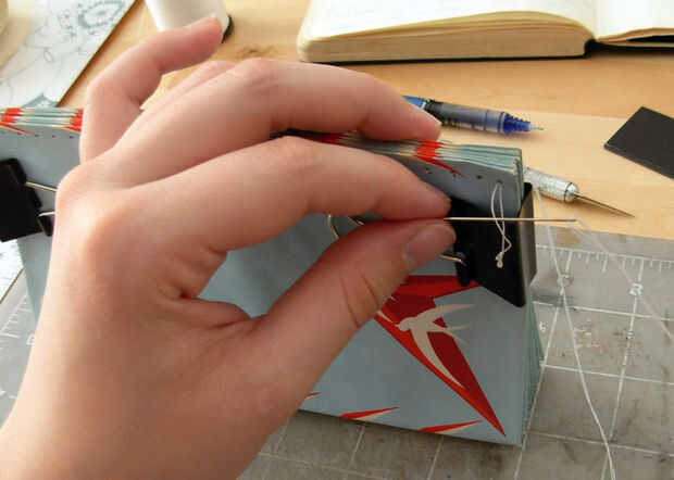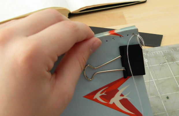 Comience introduciendo la aguja en el primer agujero (cuadro 1). Tire del hilo a través de hasta que el nudo es cerca de una pulgada lejos del agujero. Lazo la aguja alrededor de nuevo e inserte a través del hilo doblado delante del nudo (Fig. 2). Tire de autodidacta y vuelva a insertar la aguja por el mismo agujero en los sobres (cuadro 3). Jalar que el hilo a través de y lazo de nuevo, esta vez permitiendo que el hilo de bucle el borde superior de los sobres (cuadro 4). Una vez más, vuelva a insertar la aguja por el mismo agujero. Tiran a través y hacia el segundo agujero y repetir el proceso de costura (cuadro 5).