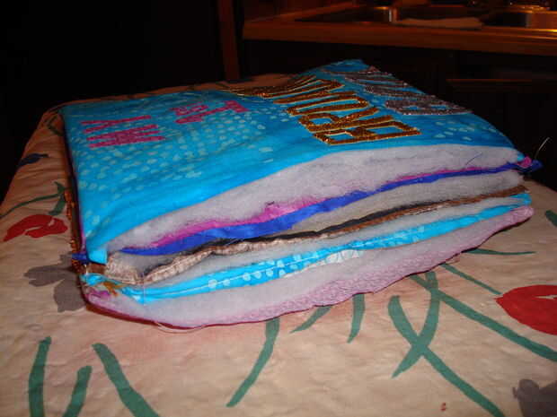 4. corte las piezas de tamaño de página de bateo. Dependiendo del tamaño de bateo le elige, usted puede usar una o más piezas entre cada conjunto de las páginas. He utilizado 3/16 de pulgada de bateo y poner dos capas entre la mayoría de mis páginas. Porque las páginas de Camelot y Cenicienta ya estaban hinchadas, el espacio entre las páginas necesita sólo una hoja de bateo.