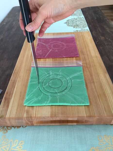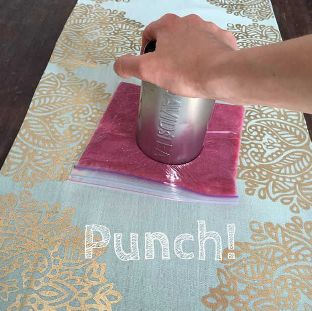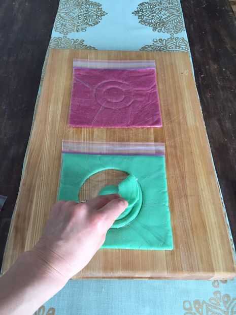 Después de quitar este bolso ziplock de la capa externa, tomar la página de plastilina y en el centro exacto usar el más pequeño (de ambos) para perforar un agujero. Esto puede perforar a través de si tiene bordes afilados. Si no, cortar sobre una tabla de cortar con un cuchillo. Quite el agujero.