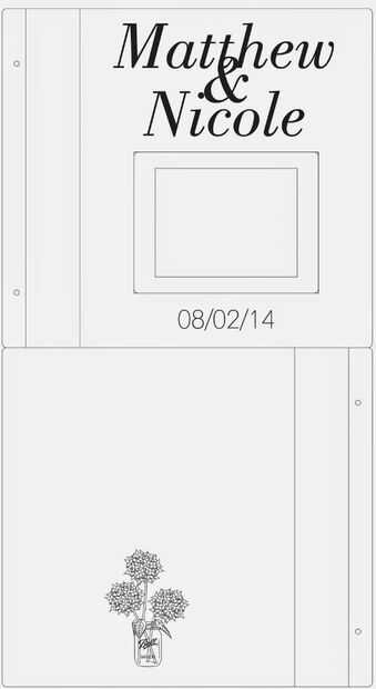 Entonces, decoré las cubiertas. Según mi maqueta, quité un rectángulo para una fotografía de la pareja. Incluido también otro rectángulo para servir como guía para cortar la mata más adelante. Puse los dos nombres por encima del rectángulo y su siguiente de la fecha de la boda. Estaba en buena forma en este momento, pero decidí que necesitaba para hacerla aún más su estilo y especial. Utilicé la herramienta pluma para trazar un tarro de masón (mis sentimientos personales sobre tarros de masón a un lado), a continuación, saqué un pétalo duplicado en una flor y luego que duplicado a tres inflorescencias. He añadido tallos y hojas. Entonces tuve que romper y sacar un montón de rutas.
