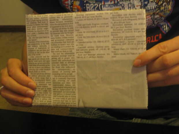 ACU cuestan cerca de $70 (USD) un conjunto, superior e inferior.  Así para maximizar nuestros recursos hemos decidido hacer un patrón con una hoja de periódico, que abarca el libro como un libro de texto escolar.