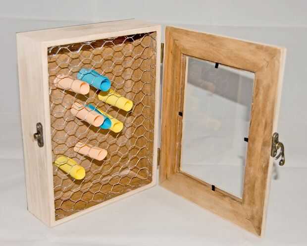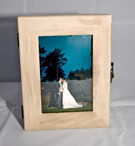 Puede atesorar su caja sólo con el vidrio de manera que los rollos de papel se exponen, o después de la boda, decorarlo con una bonita foto.