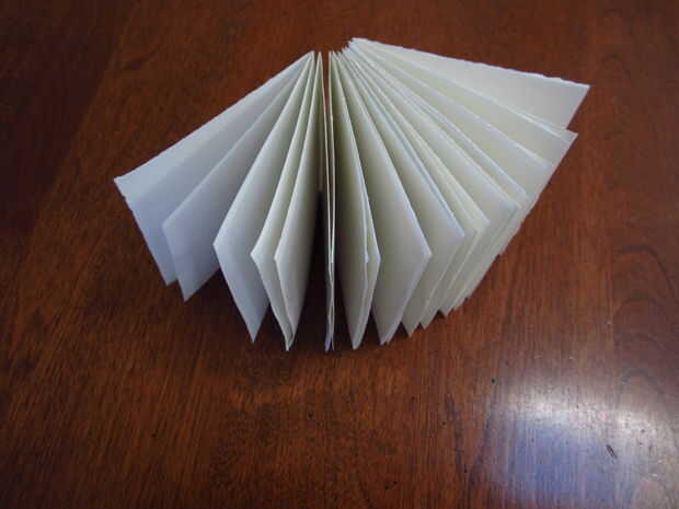 Ahora, doblar cada pieza por la mitad y distribuir 3 piezas en 4 montones. Luego, en cada montón, poner una pieza en otro en otro. Terminarás con 4 firmas (grupos de páginas), cada uno con tres páginas doblados superpuestos unos a otros.