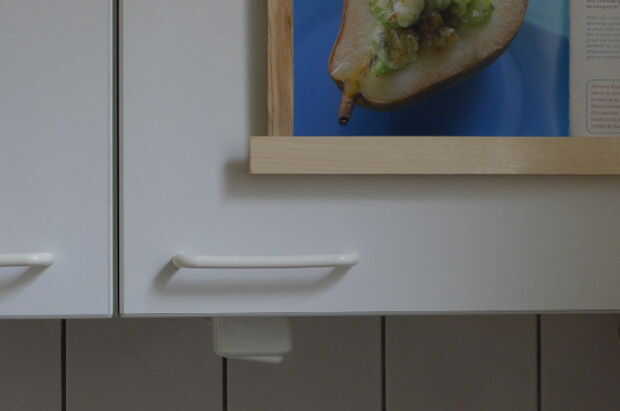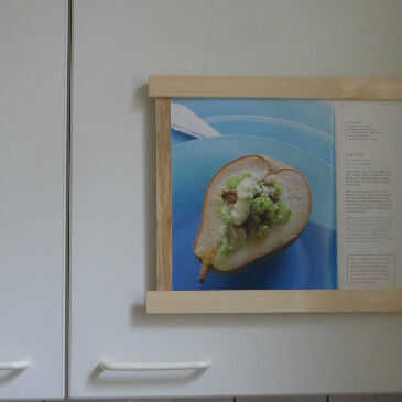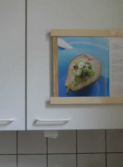 Por ejemplo, la suspensión puede ser fijo en la cocina en un armario. Esto es muy útil para la visualización de un libro de cocina, sobre todo porque generalmente no es necesario para pasar las páginas mientras se cocina. Para la fijación de la suspensión del libro en un armario de cocina sugiero para usar cinta doble cara espuma en orden de no para dañar los paneles frontales. Alternativamente, pueden utilizarse cuerdas delgadas para colgar de la percha en la puerta del armario (fijar la cuerda en la parte trasera de la puerta envolviendo alrededor de un tornillo, un gancho de tornillo o un clavo). El más confiable y estable, sin embargo es utilizar tornillos para fijar la percha en un armario de cocina o en la pared (que afecta a la superficie respectiva).