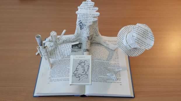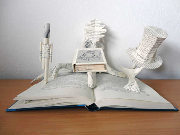 El libro que hice tiene algunas partes que tienen que ver con H.C. Andersen y piezas que se encuentran en sus historias. La pieza central de la escultura es un viejo roble. La única historia que realmente es en el libro en el que se encuentra. Una de sus raíces levanta un sombrero de copa. Este sombrero a menudo se asocia con H.C. Andersen, por lo que no podía faltar de la escultura. Puesto que él escribió historias, otra raíz levanta un pequeño libro 'escrito' por él. En uno de los rincones es un guisante, también un cuento de hadasde Andersen. Y dos de sus más famosos cuentos se encuentran también en el libro, el soldadito de plomo y la Sirenita.