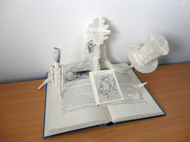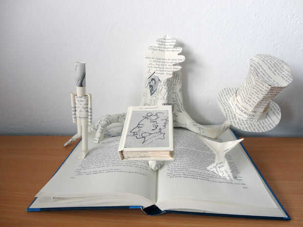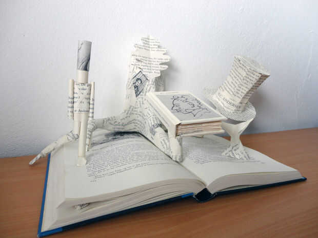 Tan pronto como terminen de todas partes, es hora de montaje. La primera parte a colocar es por supuesto el árbol, la pieza central de la construcción. Se pega al libro en varios lugares. En segundo lugar viene el sombrero, se coloca en la raíz señalando en el espacio, esta es la única pieza de la escultura que no pega con el resto. El pequeño libro se pega con el resto del libro. Al principio era mi idea de no pegar el libro, pero la raíz del árbol no apoyaron el libro bastante por lo que tuvo que ser pegada para evitar que se caiga. El soldadito de plomo y la bailarina de papel se pegan en la siguiente. Porque están parados solamente en 1 pie, se pegan juntos para asegurarse de que el soldado y el bailarina soporte recto, que esto puede verse en el paso de bailarina. La bailarina también se pone un poco detrás del soldado porque el soldado es el protagonista de esta historia, no la bailarina. Finalmente la cola de las sirenas fue pegada al libro. (Recuerde que el guisante se pega ya en lugar).