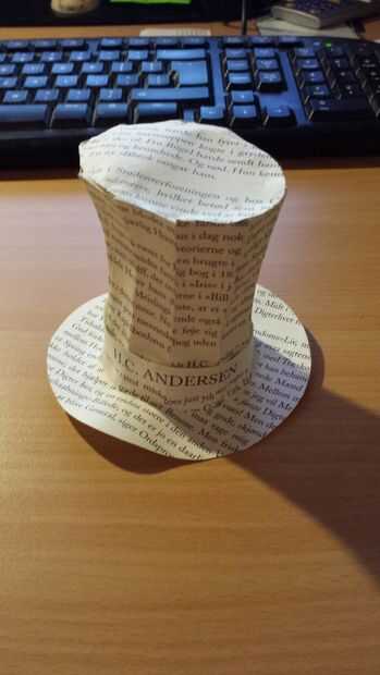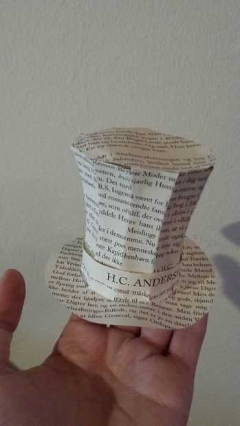 El sombrero fue hecho el mismo papercraft de la manera trabaja. Añadido un borde especial para pegar cada pieza del sombrero. Elegimos hacer las líneas de texto horizontal en lugar en un ángulo o al azar. Esto funciona para mostrar la simetría del sombrero. La parte superior del sombrero está hecha de un óvalo el fondo es redondo. Se añadió un cinturón justo por encima del borde. Porque el sombrero a menudo se asocia con H.C. Andersen, fue nuestra idea para tener su nombre en este cinturón como principal indicación en la escultura que es una escultura en sus cuentos de hadas.