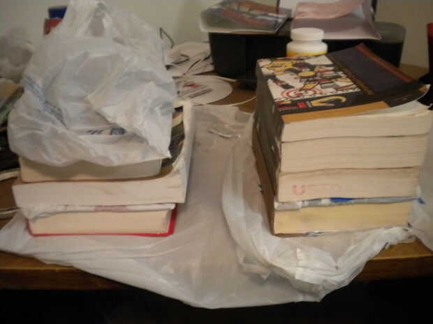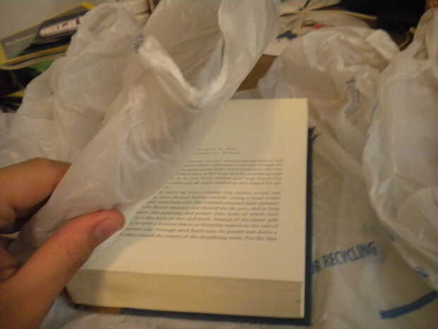 Tomar la tapa y alrededor de 10 páginas del libro y coloque una bolsa de plástico sobre éstos y tire firmemente. Luego coloque el libro en su área de preparación. Utilizando el mod podge y la cubierta del cepillo de pintura el borde exterior del libro con una buena capa de mod podge. Levante la parte posterior del libro y pegar al dorso de la cubierta posterior. Esto ayuda a mantener el libro celebrado más adelante como el corte de arranque.