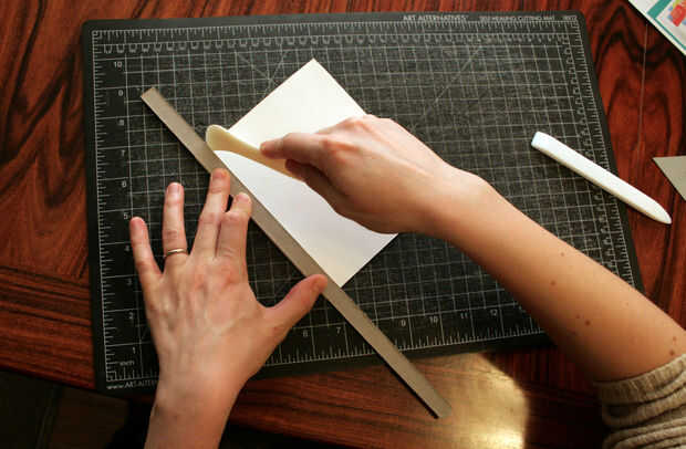 Poner la plantilla al lado del borde doblado que acaba de hacer. Ejecute su scorer de hueso en el borde de la plantilla en el interior del papel, anotando el papel para hacerlo más fácil de doblar.