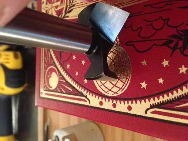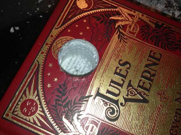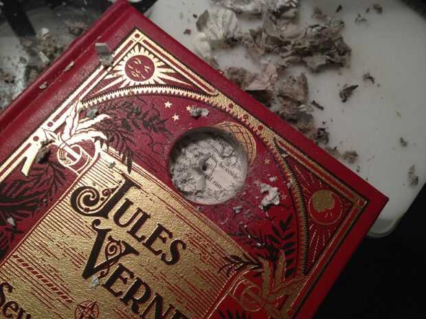 En cuanto a... de perforación debe usar mucha presión para unir las páginas del libro o simplemente se agarra y rasgar hacia fuera. He utilizado un taladro de mano así que simplemente estaba en el libro pero sería una mejor manera de usar las pinzas en una prensa del taladro. Asegúrese de limpiar el bit a menudo. Usé una velocidad media con ligera presión para la cubierta y pulsos de alta velocidad con una presión moderada para pasar las páginas.