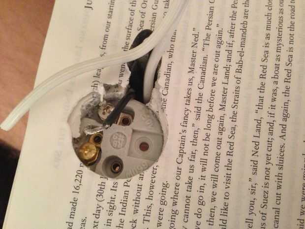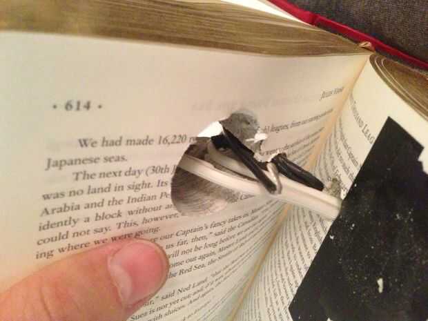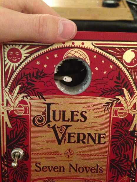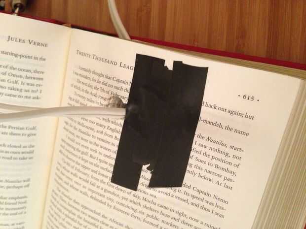 Ahora la diversión parte. Abarrotar el zócalo del bulbo en el agujero mientras que siendo capaces de mantener las páginas del libro acostado. Sólo tomó un poco de tiempo y esfuerzo pero inicialmente pulsando en y después la manipulación con el libro abierto a la página donde la base de la toma sentaría (uno con la cinta aislante), pudo conseguir en.