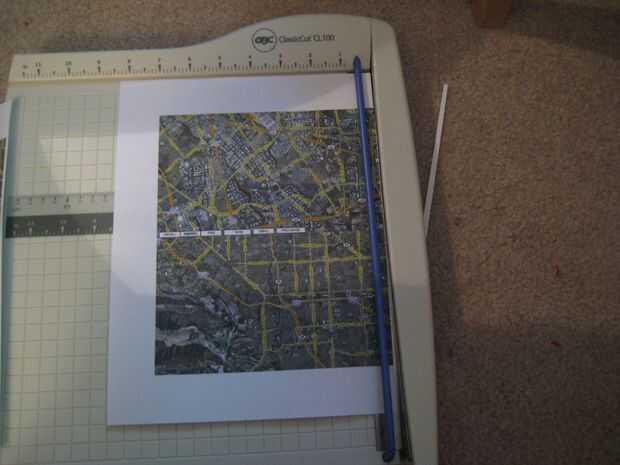Una vez que su impresión, recortar el margen blanco interior con el cortador de papel y cinta cuidadosamente las dos mitades del mapa, teniendo cuidado de alinear las calles y los nombres de las calles así que coinciden exactamente.