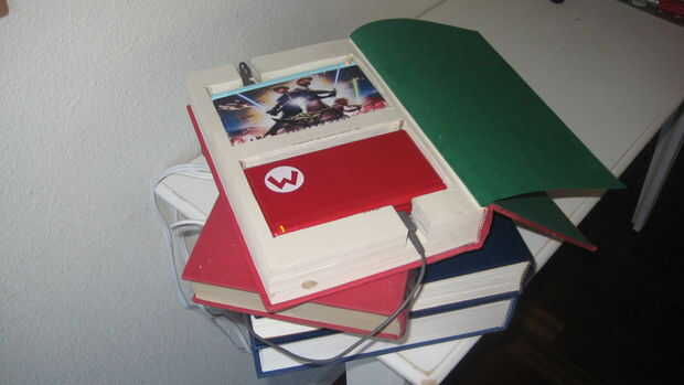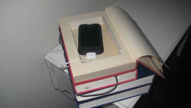 mi familia ha acumulado una considerable colección de dispositivos electrónicos portátiles y con él, un surtido de dispositivos específicos de cables y enchufes. no soporto los espaguetis electrónico poco atractivo que se cocina sobre la encimera de la cocina. es un feo recuerdo de hasta dónde hemos llegado como un pueblo donde nos hemos sustituido aparatos de juegos electrónicos, teléfonos celulares, pdas y i-whatevers, para un buen libro o instructivo de la literatura. Sé que soy culpable de comprar en esta cultura consumista (y no veo ningún final a la vista para mí). así que he disfrazado esos dispositivos electrónicos molestos (pero divertidos y útiles) en la más irónica de lugares - el libro común. He ahuecado de una pila de libros que resguarda los acordes de la energía de los teléfonos móviles, Nintendo y otros dispositivos portátiles que el ego capitalista dentro de mí se burlan.