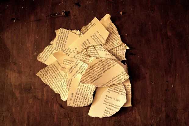 Como es de prever, es necesario cortar las páginas de algún libro y cuando hayas hecho esto, usted simplemente rompan las páginas de piezas de diferentes tamaños. He intentado utilizar las partes de las páginas donde había un montón de escribir sobre ellos porque entonces, la bolsa se cubrirán más densamente con la escritura y el resultado final se ve mucho mejor. Todavía, dejé unos trozos de página de libro con el margen original y guardado para aplicarlas a las partes exteriores de la bolsa de tener bordes rectos en el final (como se puede ver en la foto porque esto es un poco difícil de explicar)