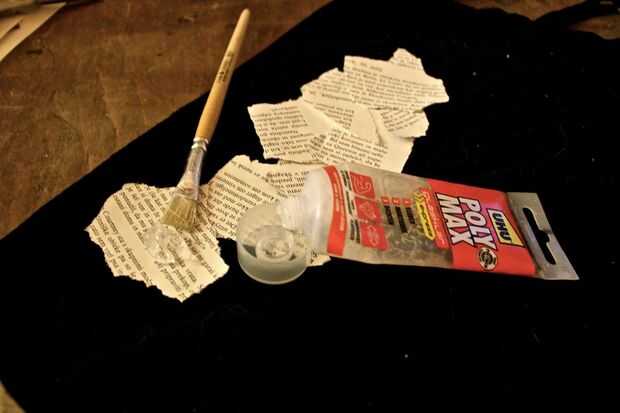 Ahora, es la parte que hemos todos sido esperando. No gran cosa, pones la pieza de madera en el bolso y simplemente pegamento el libro pedazos a la tela. Te recomiendo pegamento ambos, el frente y la parte posterior de las piezas, ya que tiene un tiempo para que el pegamento se seque y alcanzar su viscosidad final (así que no te asustes si tus páginas no pegan todo bien al principio, lo hará después de unas horas).