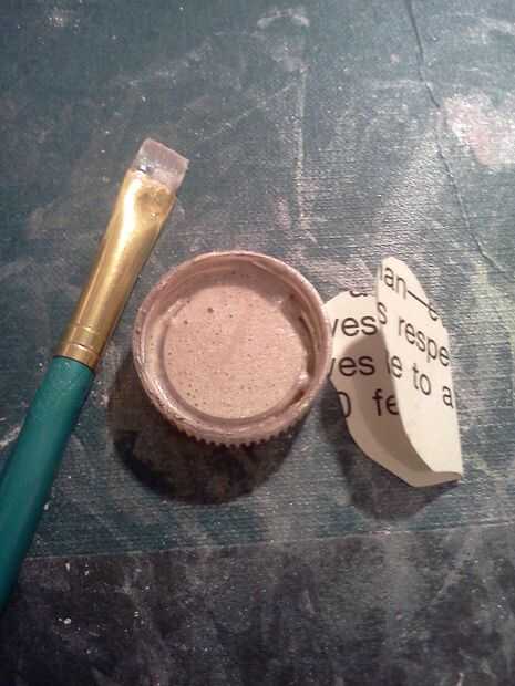 Ahora mezclar 1 parte de agua y 1 parte de pegamento en la tapa, luego Añadir sombra de ojos parte 1. Para los bordes más oscuros de la mariposa grande, utilizar un marrón oscuro o cualquier color oscuro. Las libélulas y las mariposas utilice una mezcla más ligera. Después de la mariposa grande secado usé mi dedo para sombrear las alas con un tono medio. Luego usé el esmalte de uñas brillo oro para pintar los altos puntos de la mariposa. La razón de la tapa es para asegurarse de que no seque el pegamento y pintura. Ayuda a las mariposas del doblez por la mitad y luego pintarlos, así tendrás una pequeña curva. Para las flores hice una mezcla más gruesa para pintar la con.