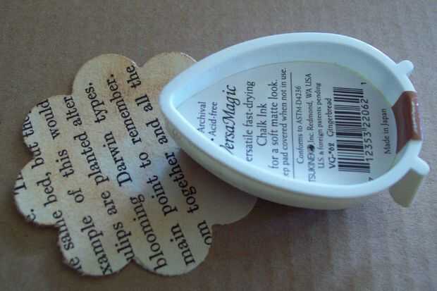 Cada flor se compone de 7 círculos festoneados perforados. Entintado con marcar con tiza la tinta antes de ser apilados juntos y se unió a brad en el centro de cada círculo festoneado.