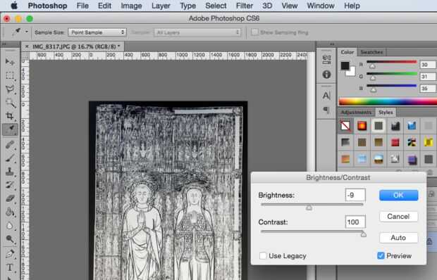 Desea que la imagen sea tan alto contraste posible. Mayoría de los programas tiene al menos un simple regulador de brillo y contraste. Utilice los controles para aumentar el contraste para que la porción de luz es tan ligera como sea posible, y la oscuridad es tan oscura como sea posible. Algunos programas también ofrecen "Niveles", "Curvas" o "Exposición". Estas son diferentes maneras de manipular el contraste y ofrecen buen control sobre el punto medio, por lo que puede mantener el detalle de la imagen. Me gusta usar "Niveles", porque es simple y tiene buen control de punto medio. Usted querrá experimentar con lo que le da el mejor contraste en la imagen.