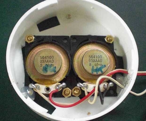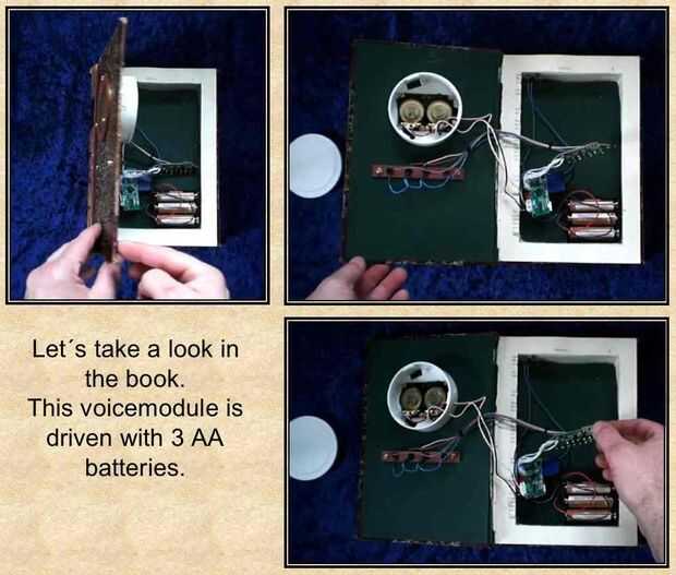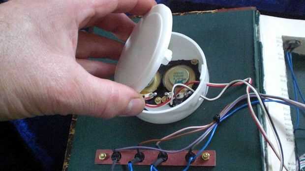 Para este libro que habla de steampunked elegí dos altavoces muy samll desde un portátil viejo y ponerlos en una jointbox como se puede ver en las fotos. Encajan perfectamente en esta caja con un diámetro interior de 70 mm.