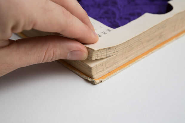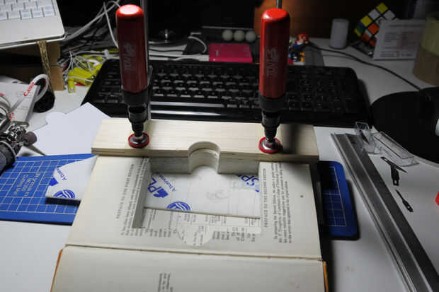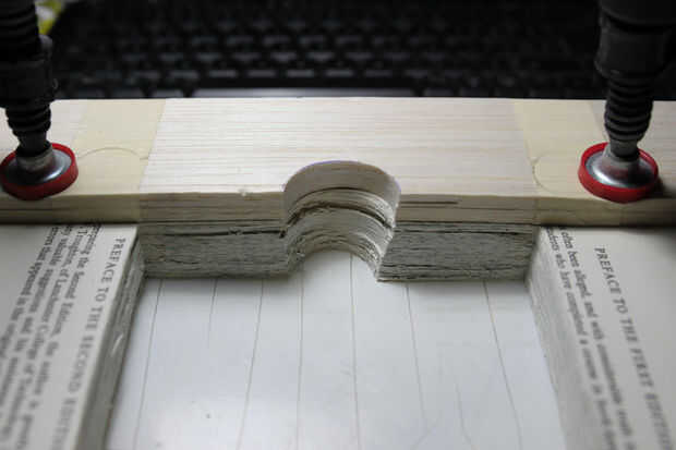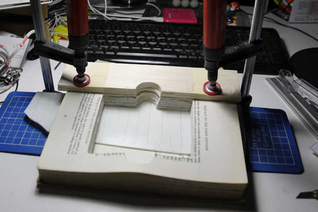 • La manera de acercarme a esto era a todas las páginas que tenía la intención de cortar, usando abrazaderas de dos bares y una doble capa de madera de balsa en cada lado, en cuanto a no dejar marcas en el libro sí mismo. Tener las páginas con abrazadera juntos le da una superficie estable para trabajar. Utilizando una matriz de referencia corté las páginas usando un cuchillo xacto. El compartimiento de corte era unos milímetros más pequeño que el tamaño necesario para ser, para tener material para compensar los posibles errores. El pasado pocos milímetros fueron quitados usando un taladro de hobby y un poco de lijadora para conseguir un muy buen acabado.