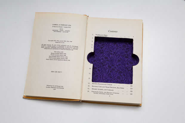 • No quiero pegar las páginas junto a uno, ni quería pegamento sea visible en el exterior del libro. Con un pincel, pegamento PVA se aplicó para cubrir todos los lados del compartimiento que era cortado y lijado. Algunas páginas estaban detrás ocultar a la tela que estiraría sobre el corte. Cuando el pegamento seca, apliqué una segunda capa y había estirada a la tela por los lados como se ve en las fotos. Cinta de raso fue pegada para ocultar las costuras de la tela en las esquinas del compartimiento. Las páginas que quedaron cubren todo hasta dejar el compartimiento mirada aseada y ordenada.