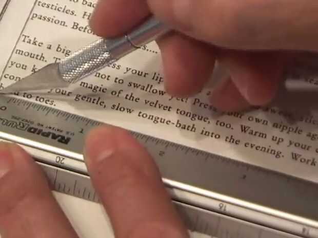 Si es algo como el libro que encontré en la tienda de libros usados, tienes que leerlo a la cubierta. Después, usando una marca de la regla de un decente área cuadrada de tamaño y recorte hasta la cubierta posterior utilizando un cuchillo x-acto o razor blade(s)