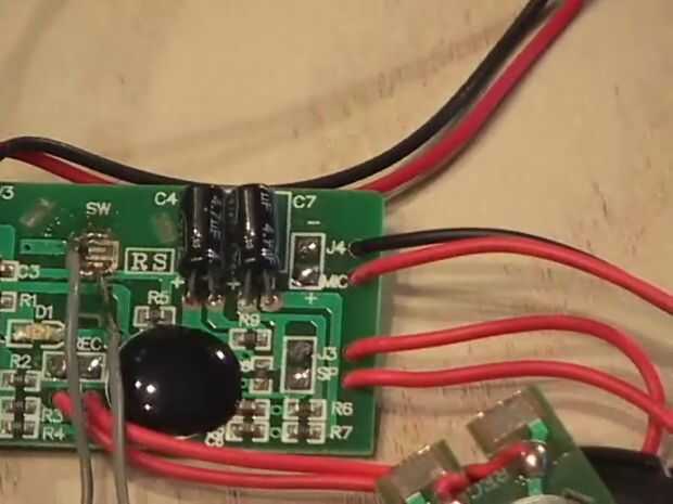 El módulo de la grabación viene con su propio micrófono así que usted puede grabar su voz, pero quería dar un paso más, así que he añadido un conector de teléfono de 1/8" a las conexiones del micrófono por lo que pude grabar nada en el módulo hasta 20 segundos tiempo. J4 y MIC son las conexiones del micrófono aparece en la imagen.