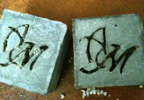 Vierta sobre las letras poco a poco... Asegúrese de que entra en todos los rincones poco:-).. .entonces vierta más y aplanar la parte superior. Debo decir vibrar la caja mucho ahora... pero ya que es espuma de poliestireno... simplemente descansar tus moldes en una tabla wobbly y sacudir la tabla... o como más tarde he pensado hacer la mezcla de cemento un poco líquido por lo que hay menos posibilidades de burbujas de aire. una vez hecho esto dejar secar.
