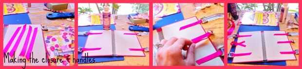 Corte 4 pedazos de cinta. Mina son aproximadamente de 4 a 6 pulgadas de largo. Cordón a través de sus manijas y pegar en tu libro que empareja los lados por lo que las asas se alinearán. (Sugerencia: hice una regla Marque la página en blanco del libro donde quiero mi manijas para ser. Este alineado perfectamente. La marca de regla será cubierta con los paneles de tela anteriores.)