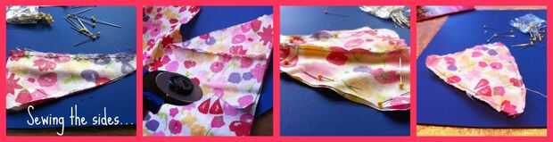 Ahora tendrá que coser los lados rectos donde cubrió. Una vez hecho esto plano abierto y lugar en su tela y corte un triángulo de juego. No corte a la mitad. Ahora pin éstos junto con la espalda hacia fuera. Coser estos juntos dejando una media pulgada o tan abierta en la parte inferior para girar de dentro hacia fuera.