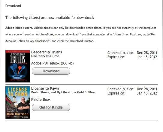 Casi listo en su página de la biblioteca - la última cosa que necesita hacer es haga clic en el botón "obtener para kindle" o algo similar que enviar el libro a amazon para que lo puedes descargar. He encontrado que es mejor que iniciar sesión en tu cuenta de amazon en una nueva ventana del explorador antes de hacer clic en este botón. Si usted no está ya conectado, la biblioteca va a enviarte a la página de amazon, vice donde necesita ir. Si esto sucede, simplemente haga clic en el administrar tu enlace de kindle para llegar al lugar correcto.