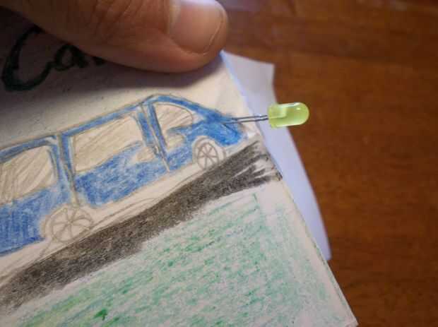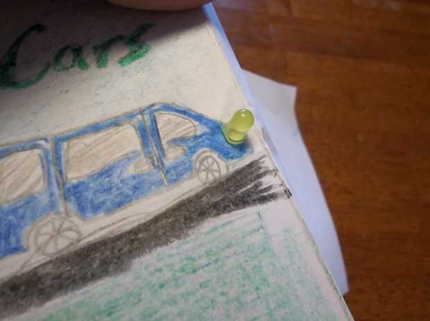 La parte difícil es asegurarse de que pones las piernas a través del papel la manera correcta para que puede doblar contra el papel con una batería de entre ellos. Por ejemplo, si están poniendo la luz cerca del lado de la cubierta, como en nuestro libro de coches que se muestra en las fotos, ponemos las dos piernas horizontal en la parte inferior del libro. Así, cuando ponemos la batería, puede doblar hacia el centro de la cubierta.