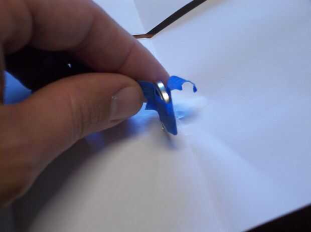 Ahora agache la batería y las patas del LED que pone de plano contra el papel, tenga cuidado de no rasgar el papel, o para mover el LED apagado el papel.