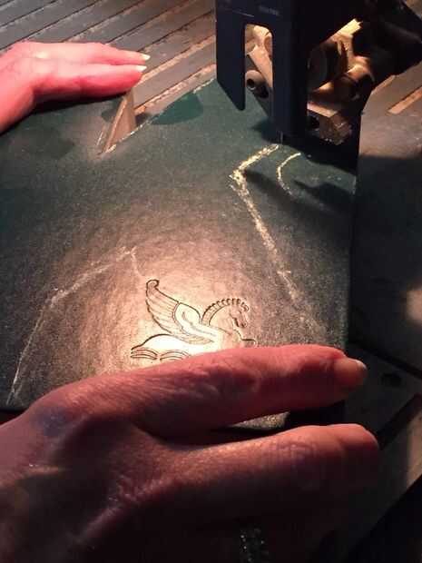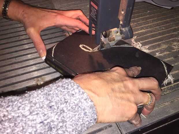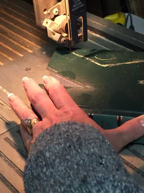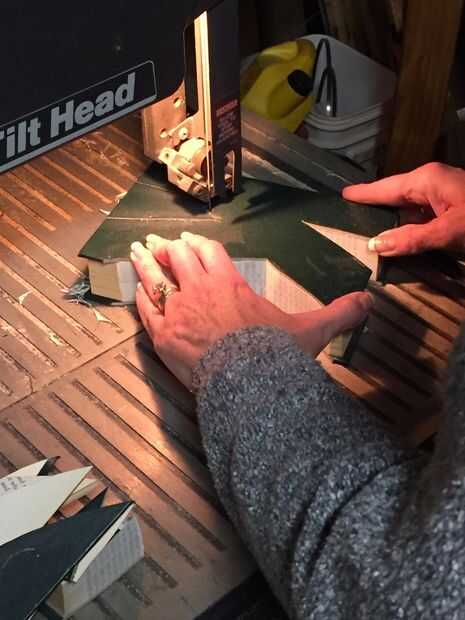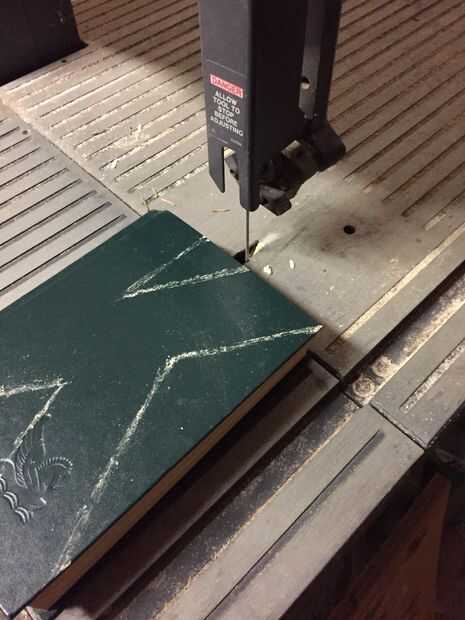 Ahora estás listo para comenzar a cortar. Mayoría de la corte con una sierra de cinta. Necesita cortar lento de manera que las páginas se cortan rectas. Te muestro un par de letras diferentes.